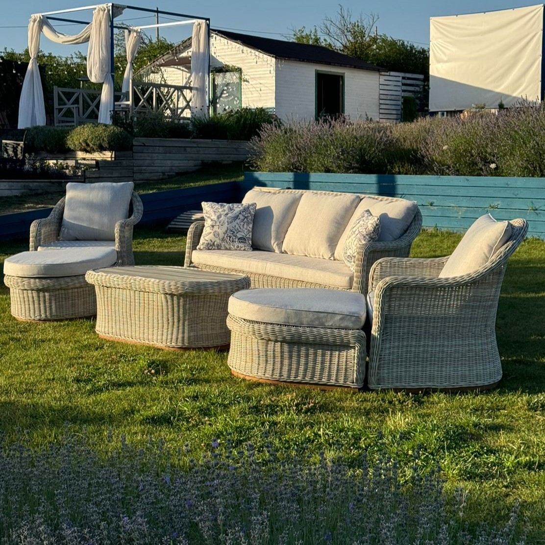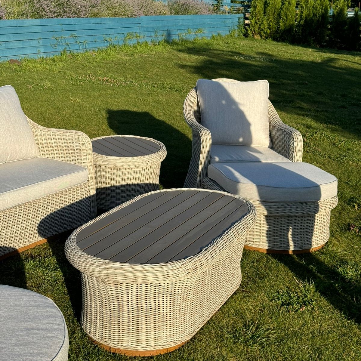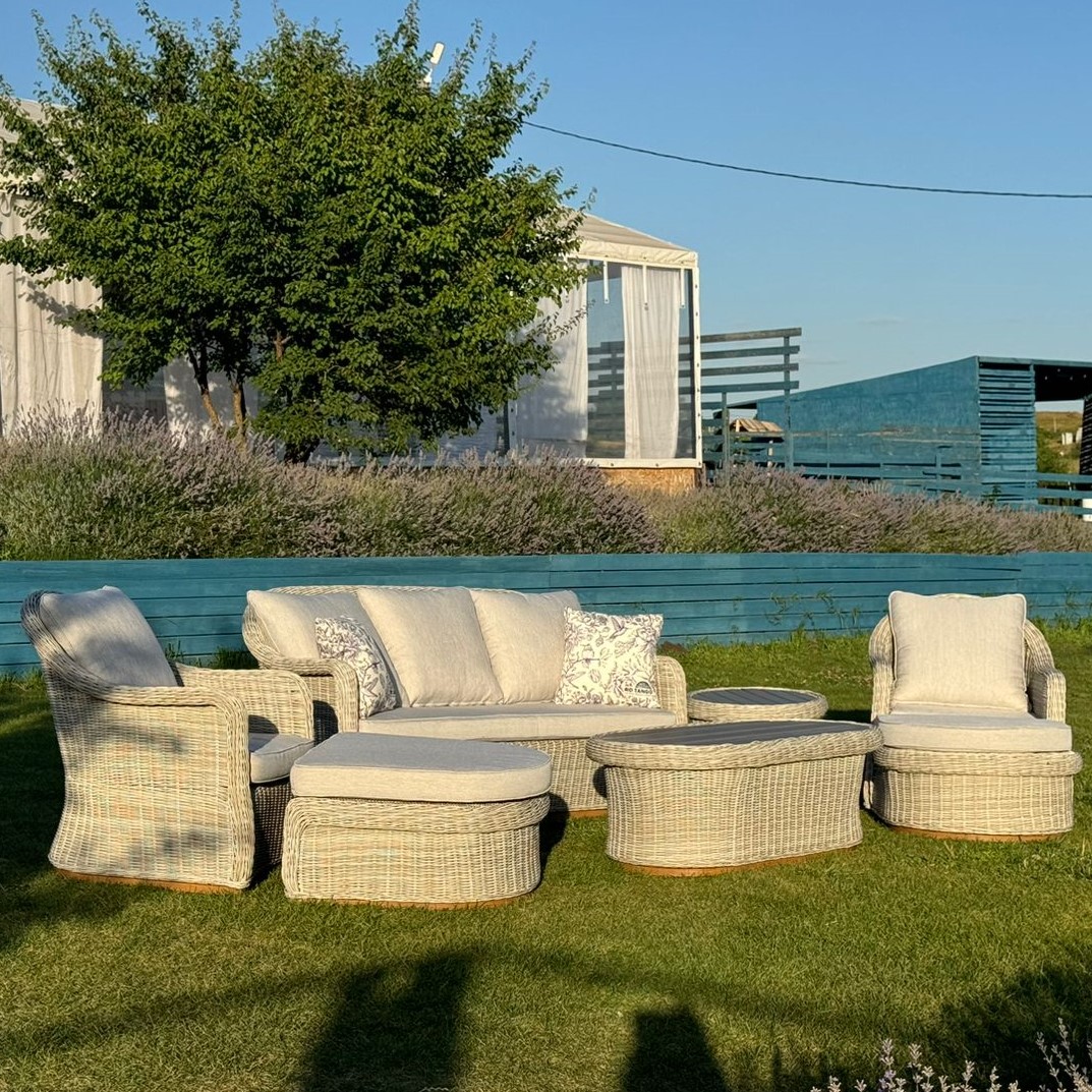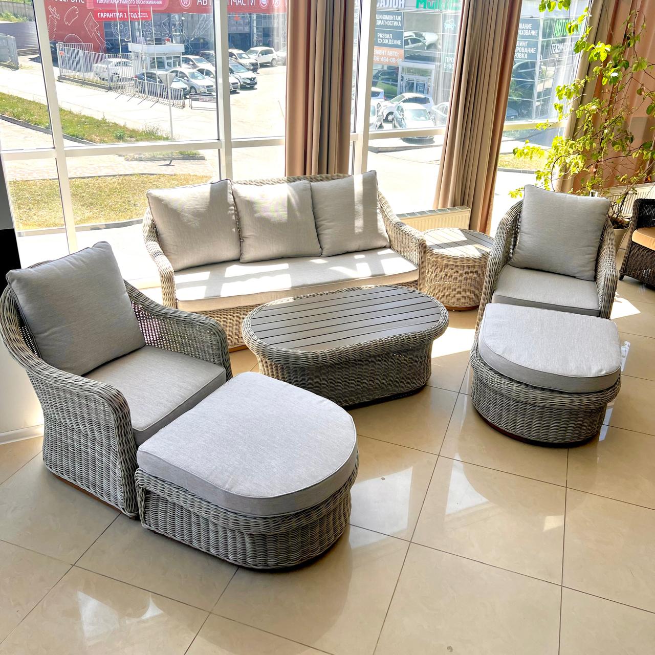 В данном комплекте не один, а целых два столика, второй столик можно использовать как угловой, а также в комплекте 2 оттоманки, которые можно использовать как подставку для ног или как дополнительные посадочные места.