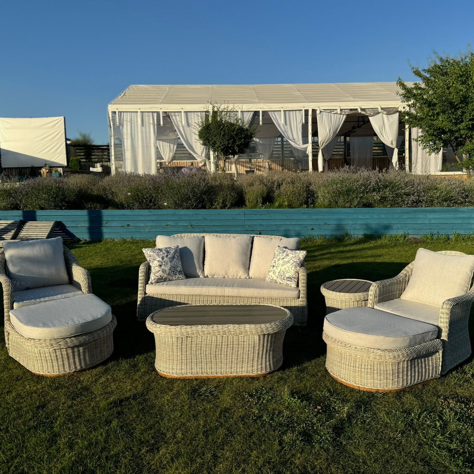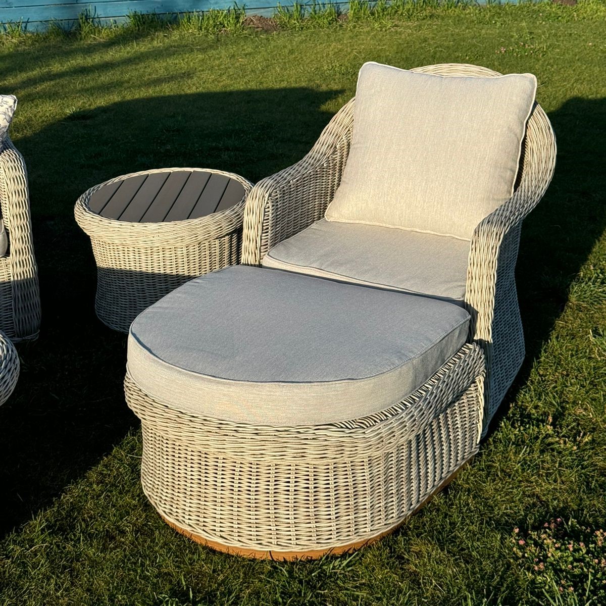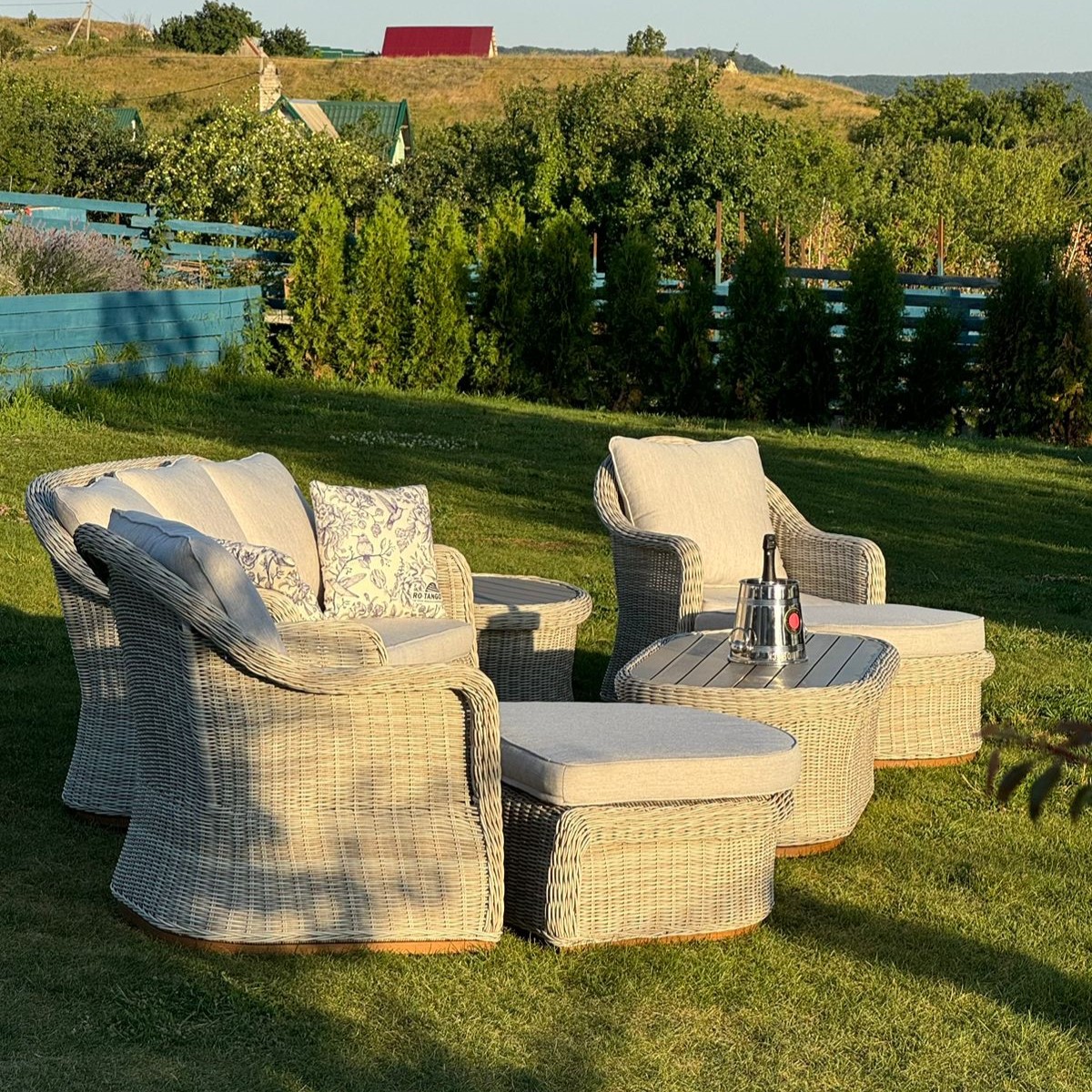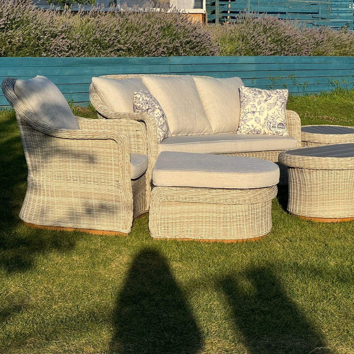 В данном комплекте не один, а целых два столика, второй столик можно использовать как угловой, а также в комплекте 2 оттоманки, которые можно использовать как подставку для ног или как дополнительные посадочные места.