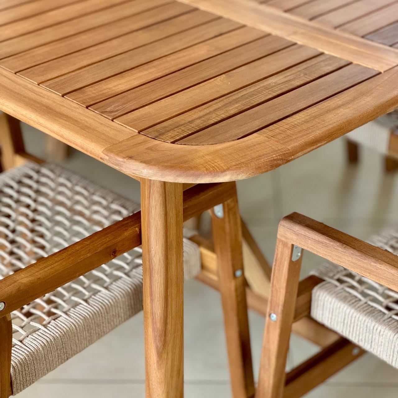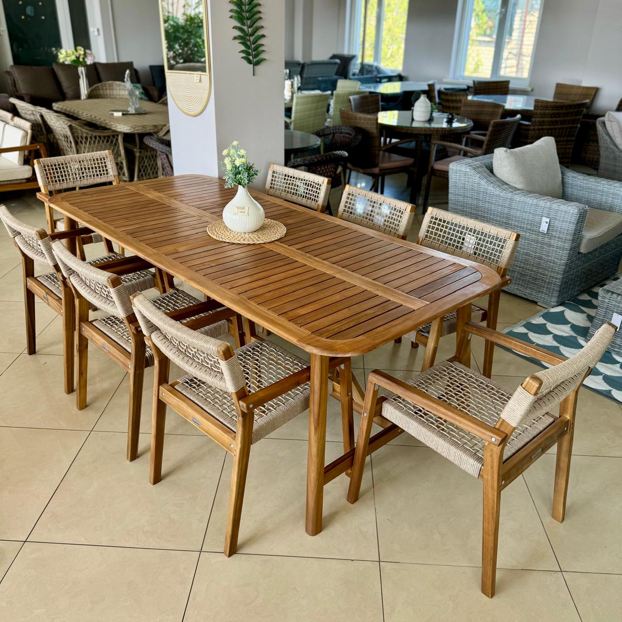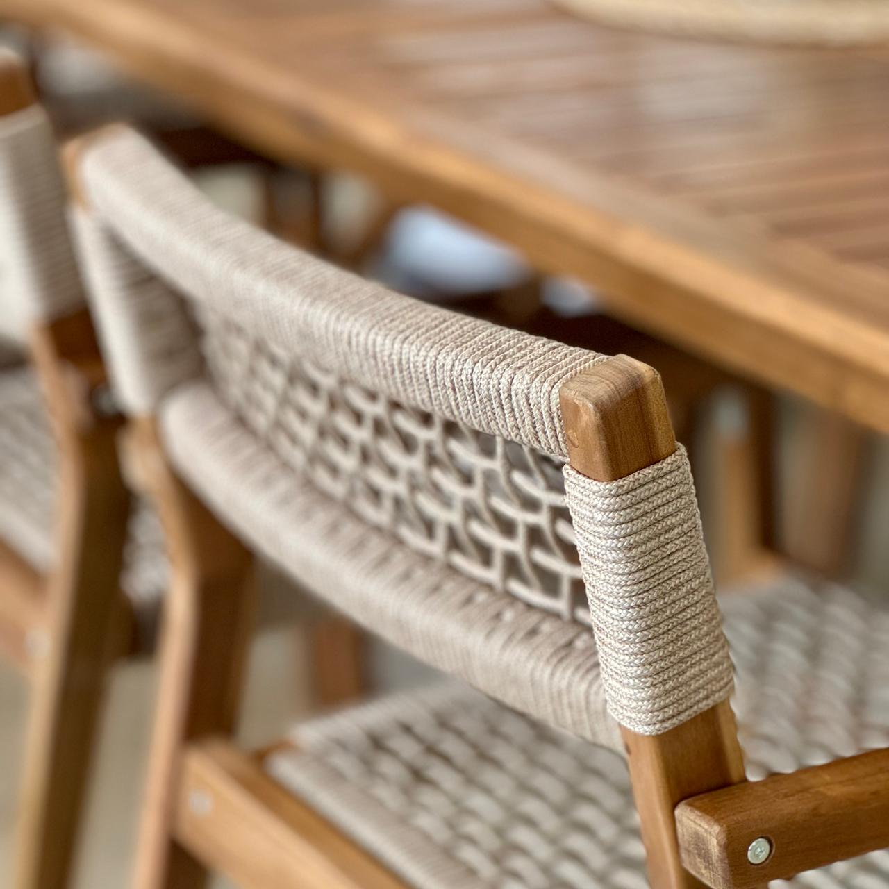 CALIPSO – современная коллекция садовой мебели из акации, выполненная в комбинации натурального веревочного плетения rope, массива акации и бежевых подушек.