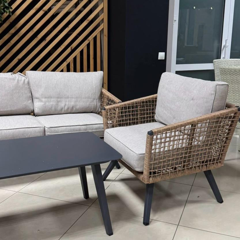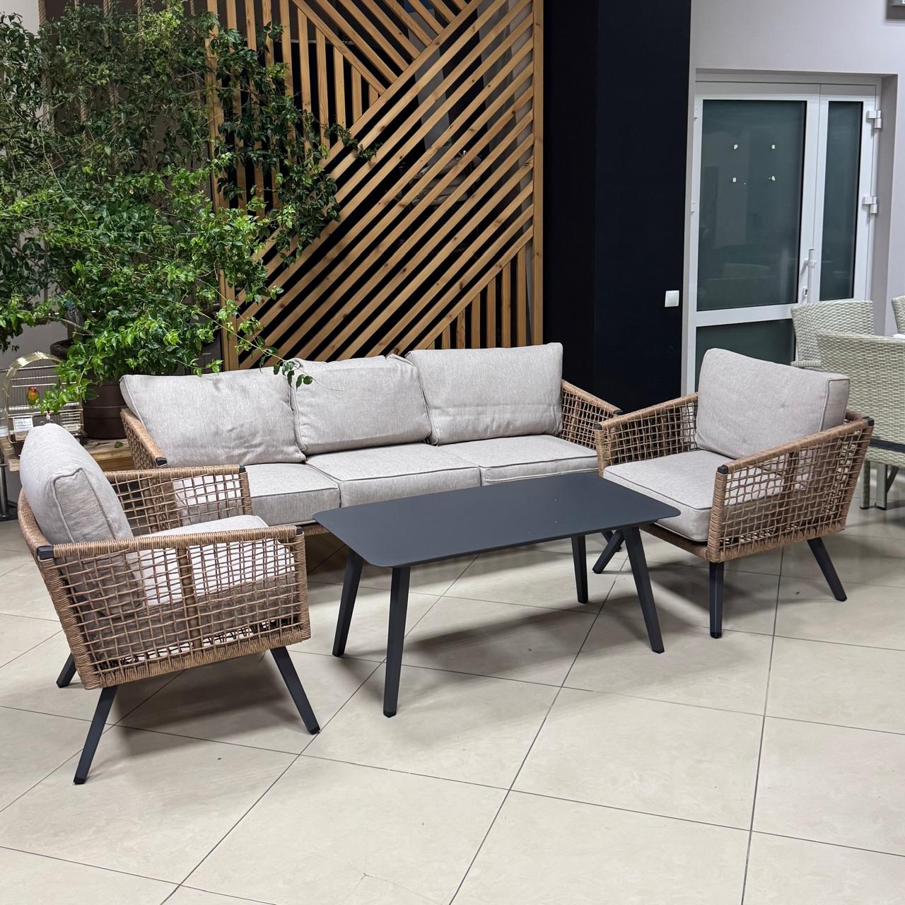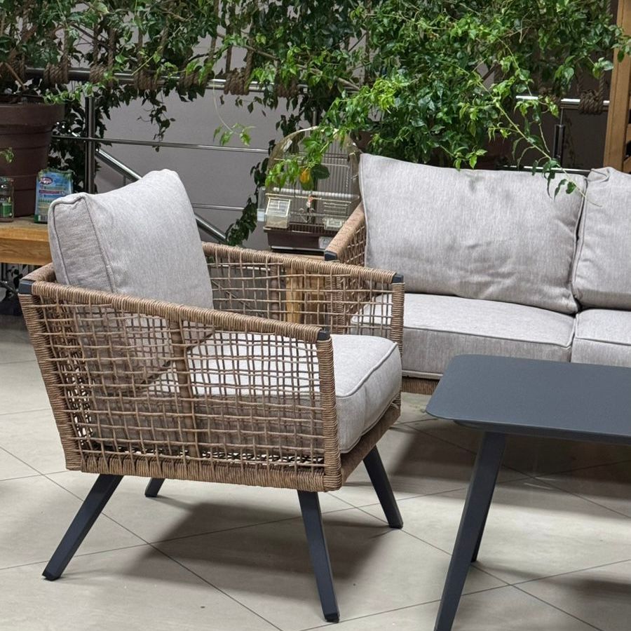 Плотные, качественно сшитые подушки, которые идут в комплекте с мебелью, красиво дополняют мебельную композицию. Чехлы на подушках съемные, их можно стирать при необходимости. На низкий сезон рекомендовано убирать подушки в помещение. А вот мебель может находиться на улице практически круглогодично, т.к. алюминиевый каркас и искусственный ротанг не подвержены атмосферным воздействиям.