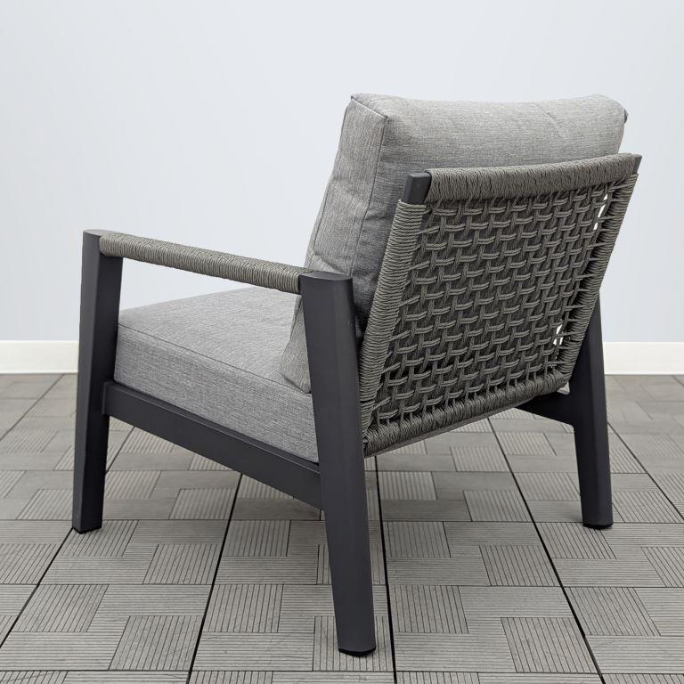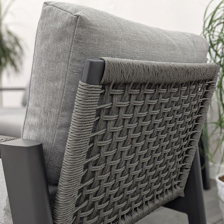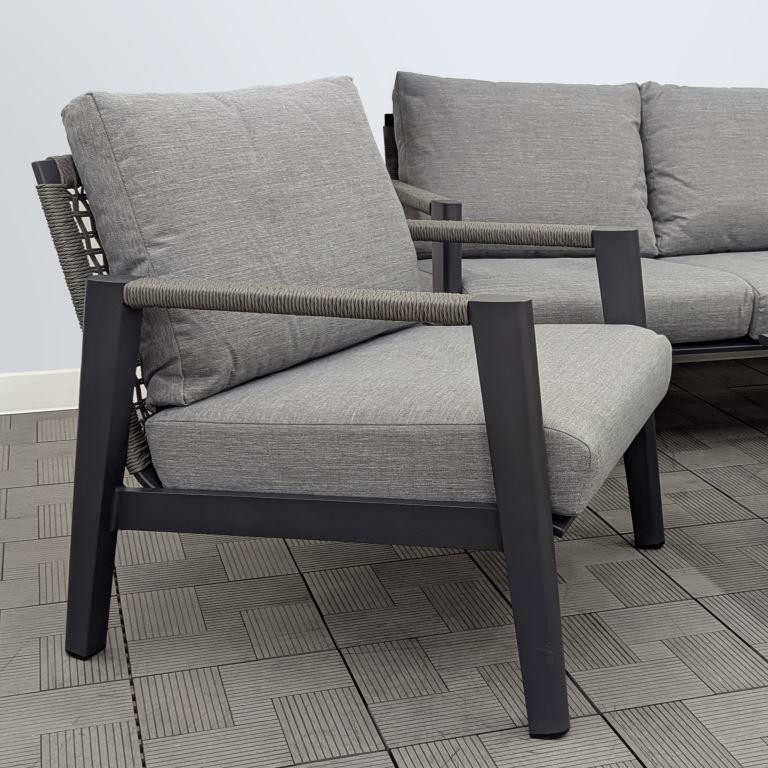 Каркас этой мебели выполнен в антрацитовых оттенках, что подчеркивает современный дух коллекции и делает её универсальной для любого интерьера. Стол с алюминиевым каркасом в цвете антрацит идеально дополняет ансамбль, выполненный в том же стильном тоне, создавая гармоничный и согласованный вид.