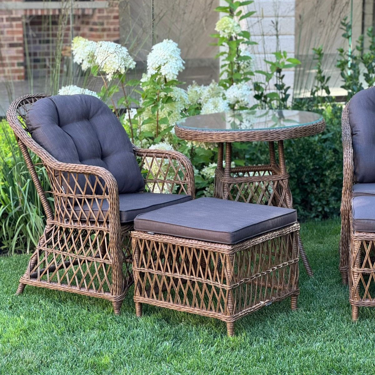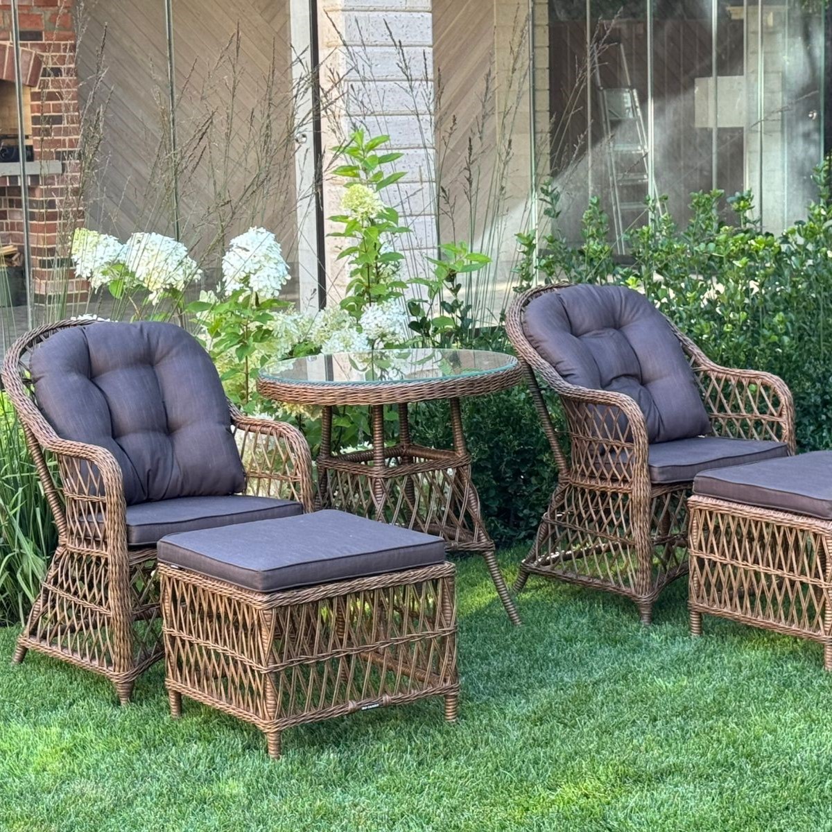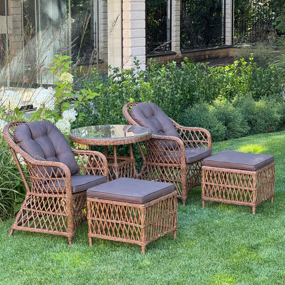 Комплект изготовлен вручную в полукруглом жгуте , кресла и софа идеально сочетаются как с плетёным столами, так и со столами из керамогранита или HPL, представленные в нашем шоуруме.