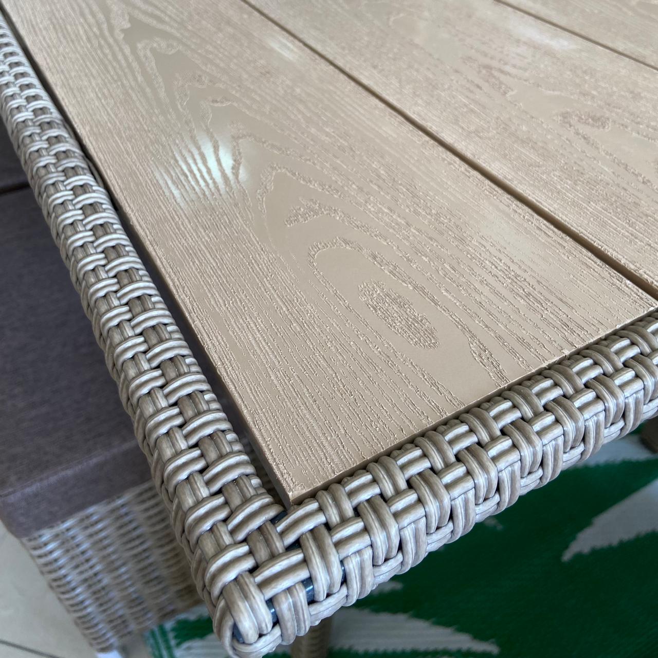 Столешница стола изготовлена из древесно-полимерного композита (ДПК), устойчивого к влаге, ультрафиолету и перепадам температур.