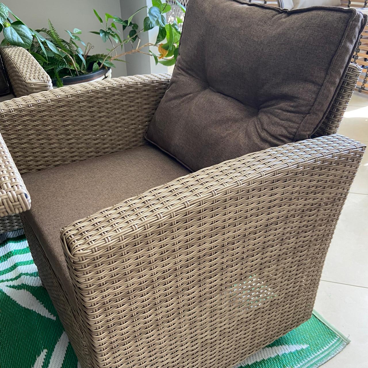 Комплект Джемм изготовлен из стального каркаса и эко ротанга.Не боится влаги,прямых солнечных лучей и мороза.Не требует особого ухода.Рекомендованная температура эксплуатации -16/+50.