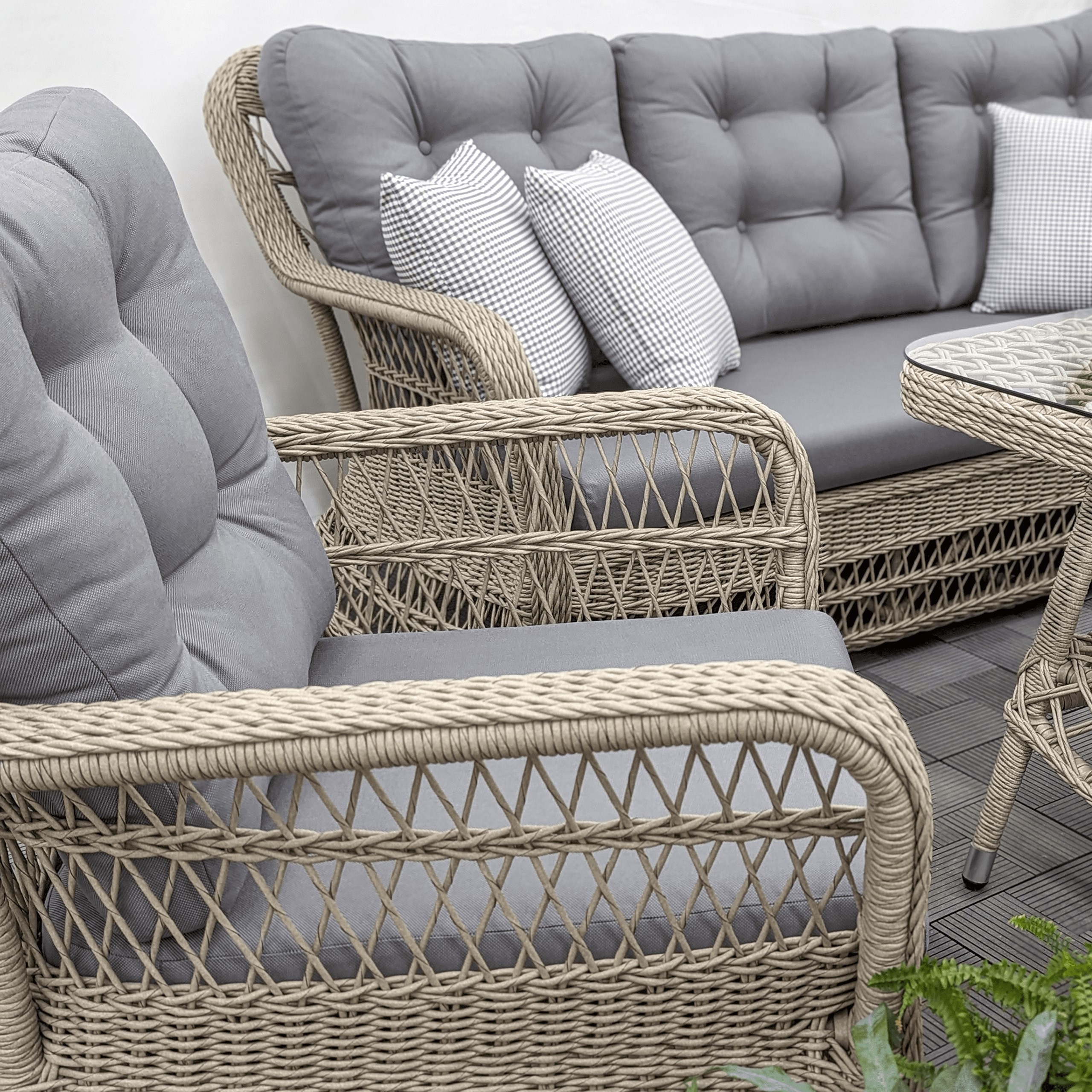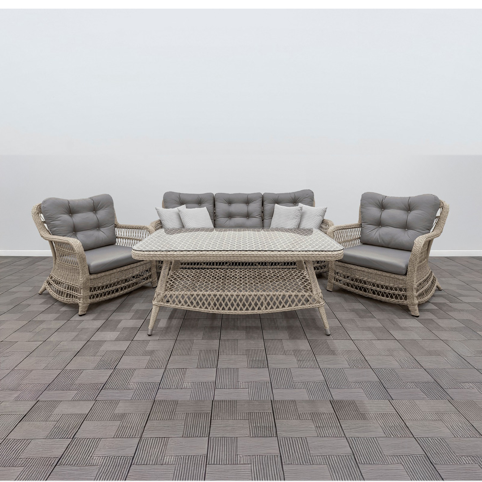 Ажурное плетение всех элементов комплекта, включая столешницу стола, украшено несколькими рядами кос.