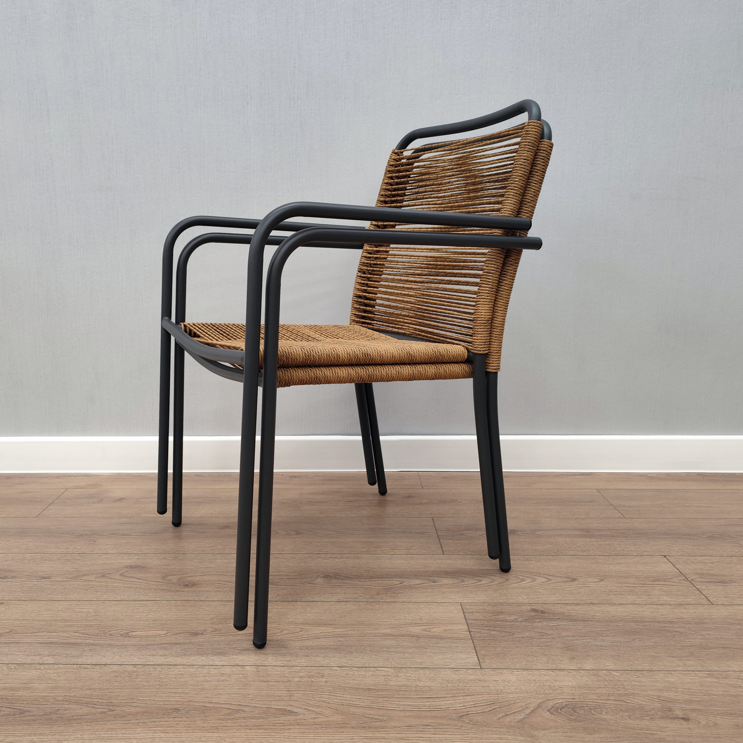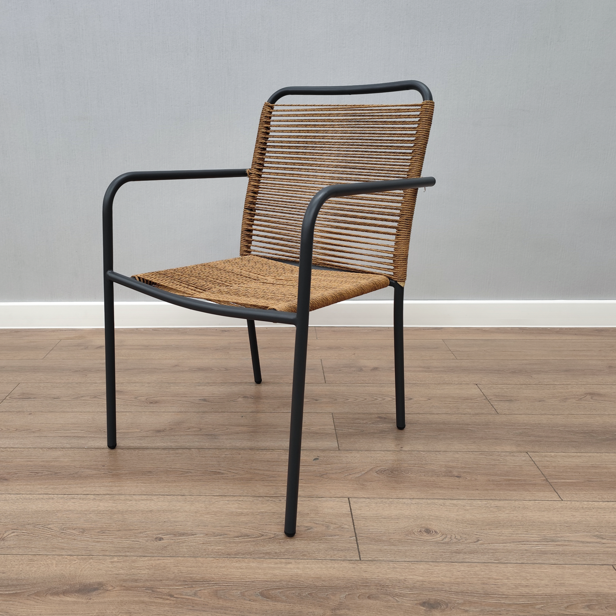 Кресло COLLETT сочетает современный дизайн и практичность. Металлический каркас в антрацитовом цвете легкий и прочный, а бежевое плетеное сиденье из жгута с декоративным переплетением добавляет уюта.
