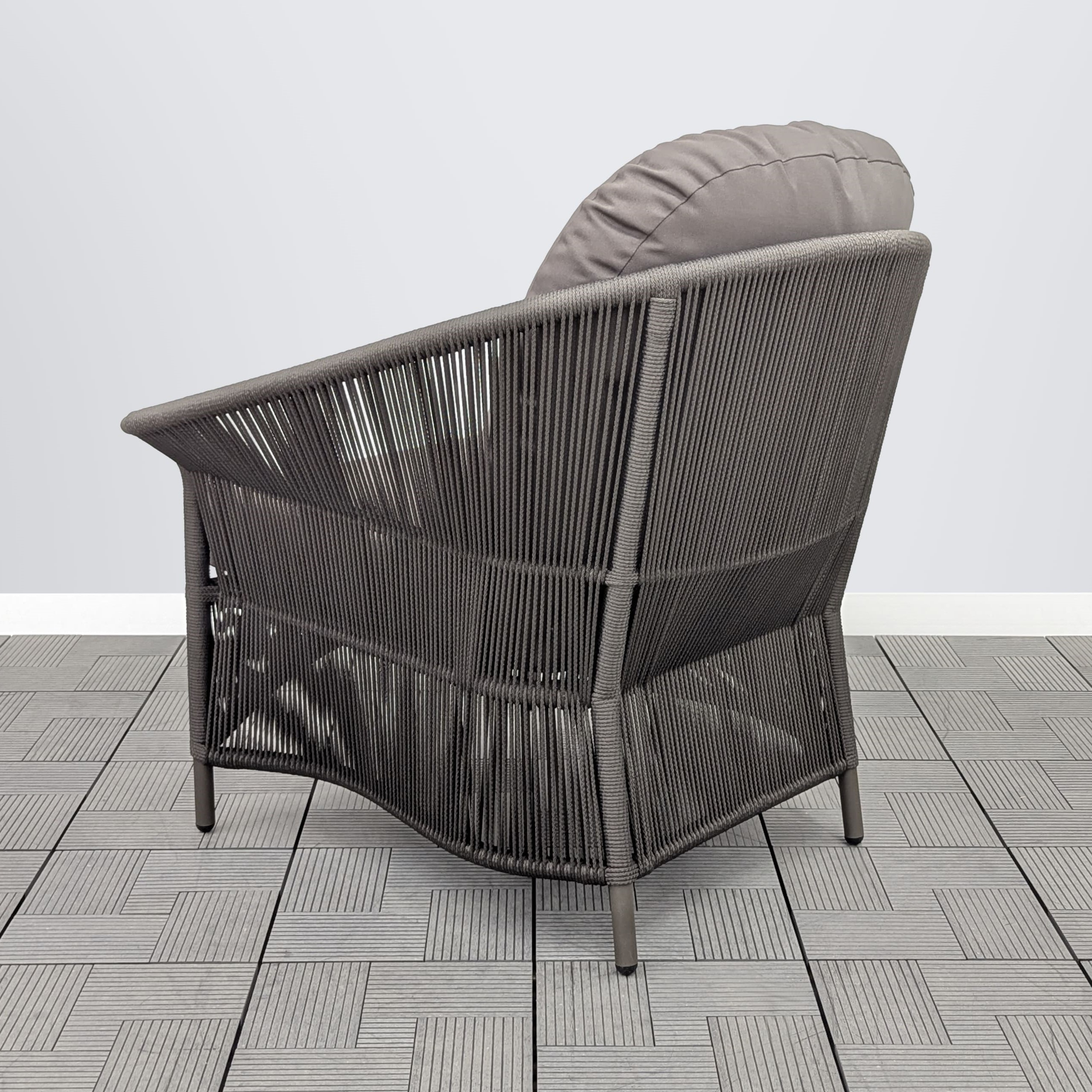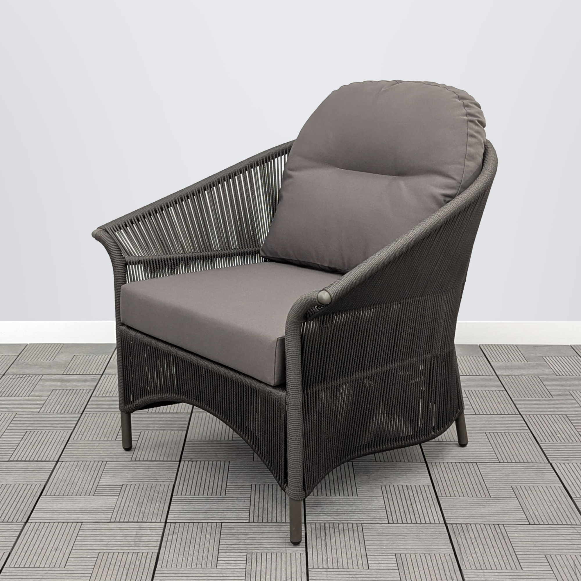 Изящно развернутые подлокотники у кресел напоминают лепестки цветка. Воздушное плетение из гамакового шнура создает невероятное ощущение легкости.