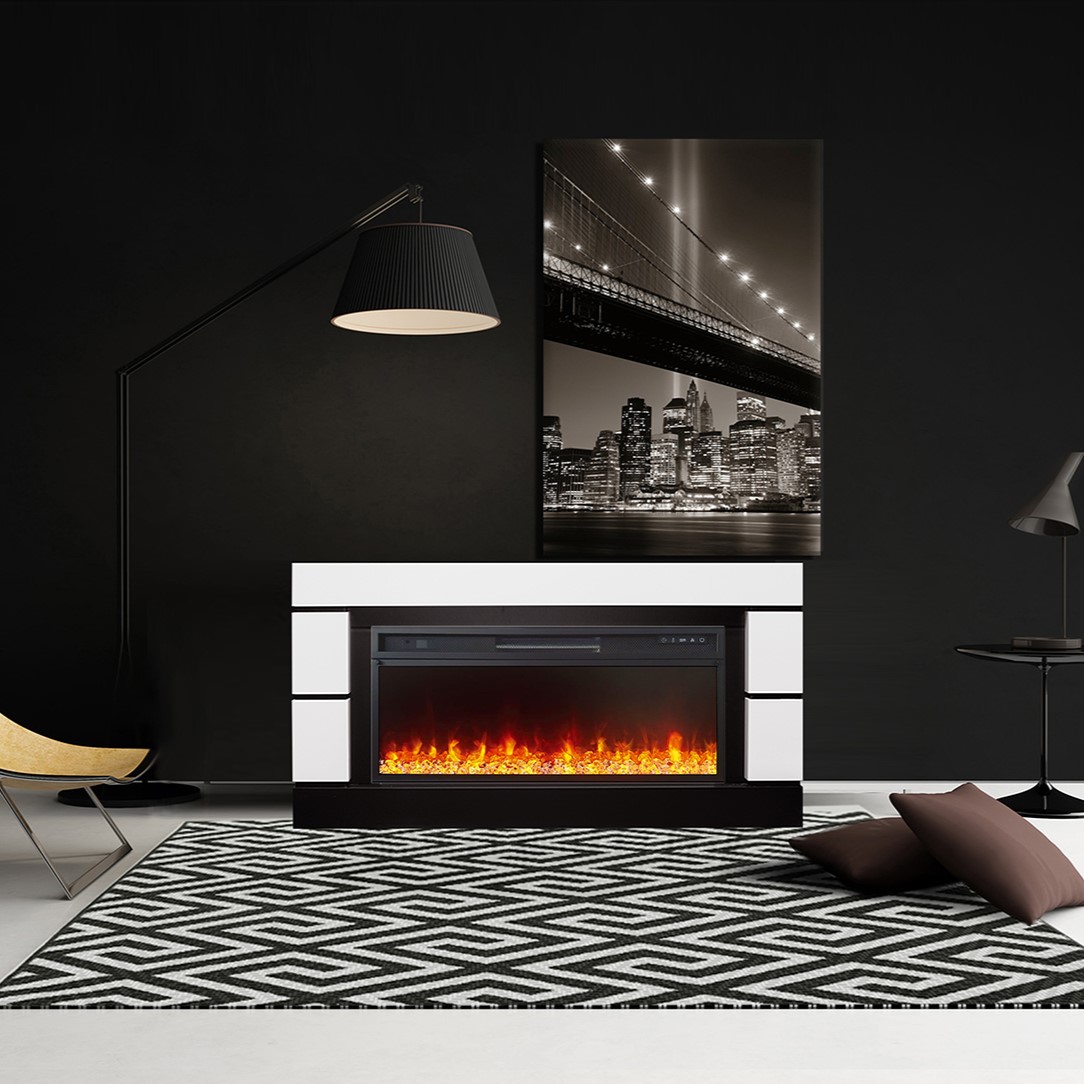 В качестве внутреннего декора используются стильные прозрачные кристаллы и разноцветная галька. Подсветку кристаллов и яркость пламени можно регулировать – доступно 4 возможных варианта. Модель дополнена звуковой имитацией потрескивания дров.